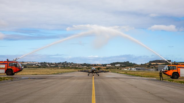Lo bomberos de la BA1 despiden con el arco de agua a los “Epsilon”, que despegan camino de su nueva base de Beja. (foto Defesa Nacional Portugal).