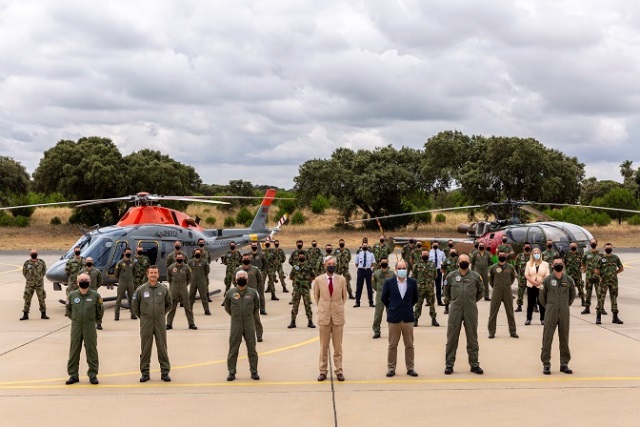 Fotografía oficial de la despedida, presidida por el ministro da Defesa Nacional (centro traje claro), João Gomes Cravinho, detrás se ve (derecha) un “Alouette” III y uno de los nuevos “Koala”. (foto Defesa Nacional Portugal).