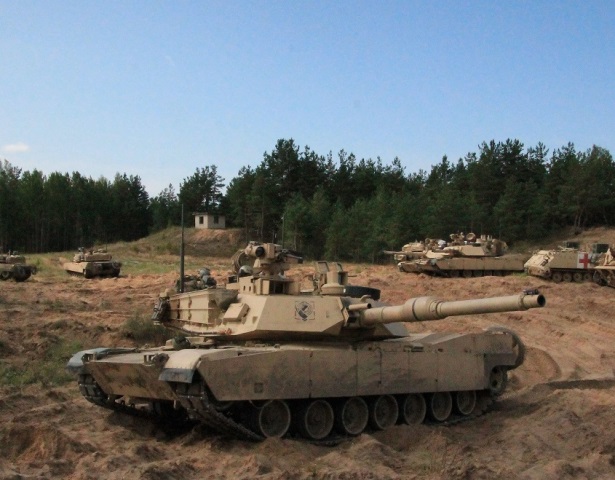 -Carros M1A2 “Abrams” desplegados en el campo de maniobras de Adazi, ala derecha se ve un M-113 versión ambulancia. (foto: NATO).