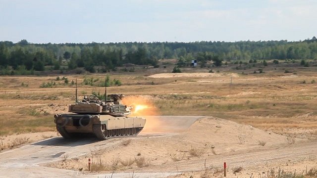 -Un M1A2 “Abrams” disparando su cañón de 120 mm en el campo de maniobras de Adazi. (foto: NATO).
