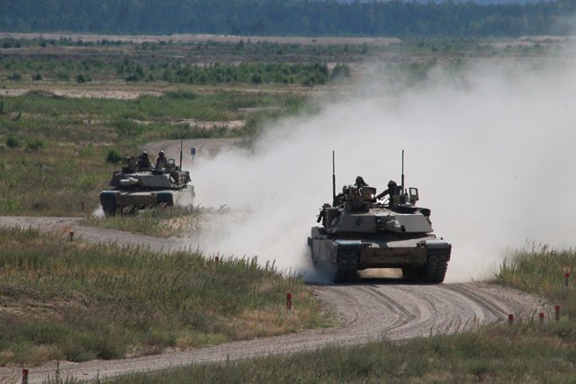 -Dos M1A2 “Abrams” avanzando a toda velocidad en el amplio campo de maniobras de Adazi. (foto: NATO).