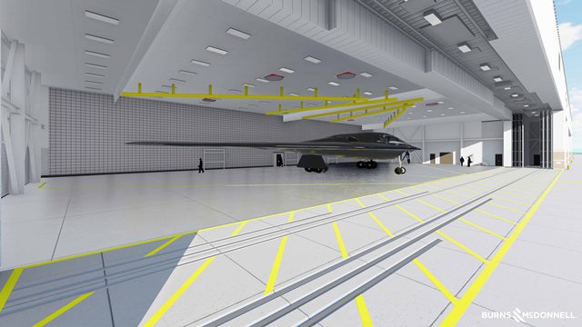 Esta reciente infografía presenta al B-21 Raider dentro de uno de los hangares habilitados para su futura operación en la Base Aérea de Ellsworth. (USAF)