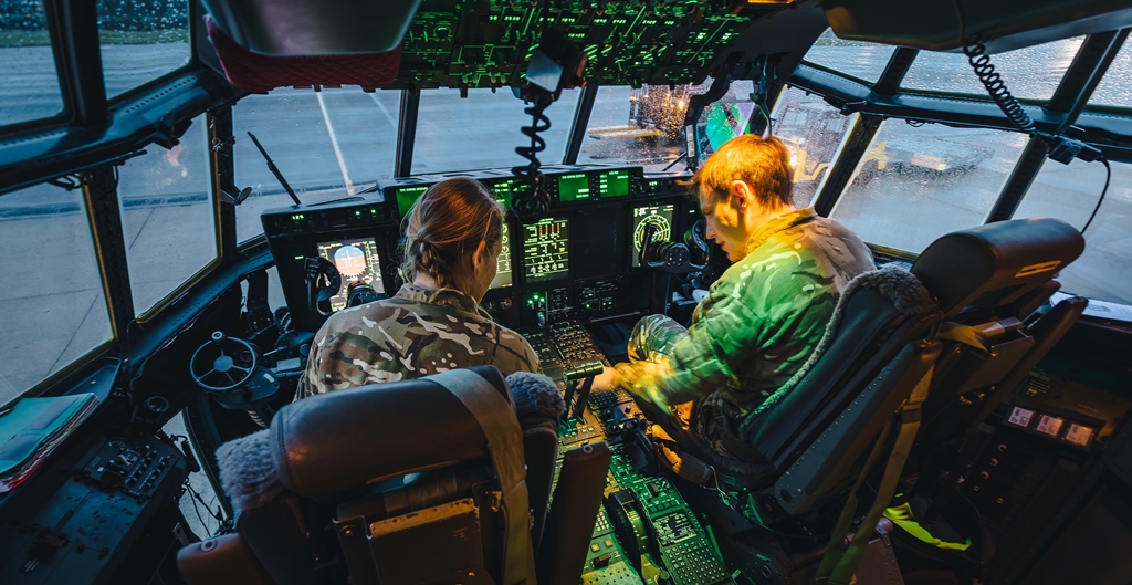 Cabina de un C-130J "Súper Hércules" de la RAF, dotada de pantallas digitales multifunción. (foto MoD)