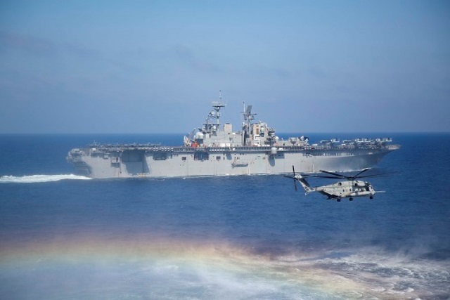 ·El navío USS Bataan durante su actual misión, en su popa se ven los Harrier del VMA-223. Foto: US Navy.