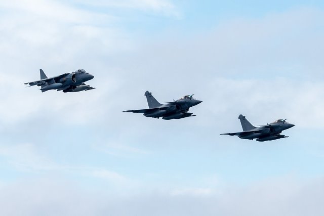Una de las muchas imágenes que está dejando el ejercicio de la OTAN “Brilliant Mariner” 2017 nos muestra una formación de aviones Harrier de la Armada españolas con Rafale de la aviación de la marina francesa, la Aéronautique Navale. Desde el navío insignia de la Armada española, el LHD Juan Carlos I, vemos en la imagen a dos Rafale y un Boeing AV-8B+ Harrier II de la Unidad Aérea Embarcada (UNAEMB)