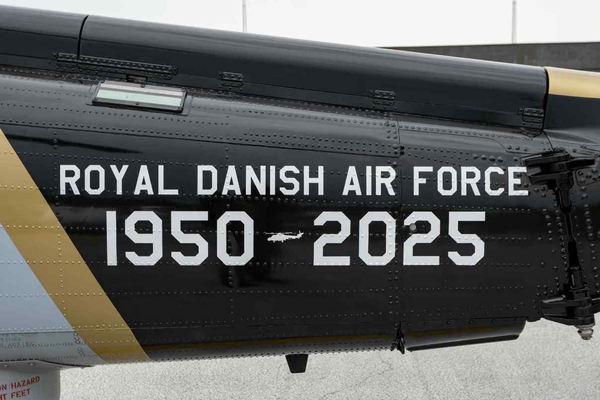 En la parte izquierda de la cola lleva pintada una gran ancla, que hace referencia al legado naval y a las operaciones marítimas de la Unidad. A lo largo del fuselaje se inscribe la fecha del aniversario y la titulación en inglés: «Royal Danish Air Force – 1950-2025». (Julio Maíz)