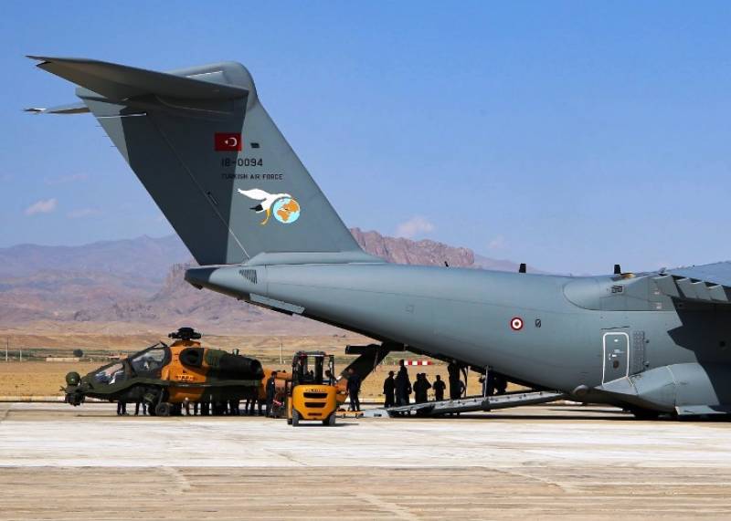 Abordo de los A400M turcos también han viajado helicópteros de transporte táctico Sikorsky UH-60A Blackhawk, al igual que los T129 pertenecientes a la aviación del Ejército de Tierra de Turquía o TKK (Türk Kara Kuvvetleri). Oficialmente el despliegue obedece a la participación de efectivos del Ejército y la Fuerza Aérea Turca o THK (Türk Hava Kuvvetleri) en unos ejercicios tácticos conjuntos azerbaiyanos-turcos.