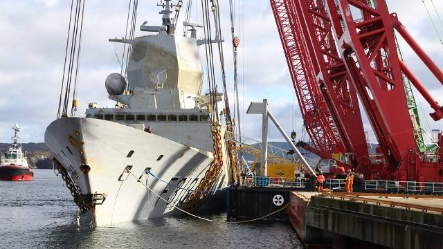 Los dos grúas flotantes, con una capacidad de elevación de 4.000 y 3.700 toneladas, llegaron a principios de enero al fiordo de Hjelte, cercano al gran puerto noruego de Bergen, pero la maniobra de recuperación se tuvo que posponer 39 veces debido a las malas condiciones meteorológicas. El operativo se pudo reiniciar este 24 de febrero, cuando los buzos comenzaron a colocar los múltiples cables metálicos debajo del casco de la fragata, aunque previamente los buceadores de la Sjøforsvaret habían neutralizado el armamento potencialmente peligroso, como informo defensa.com.