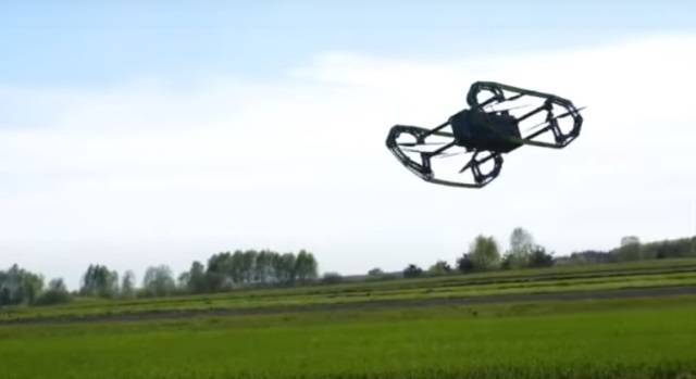 A grandes rasgos se trata de un pequeño fuselaje que alojaría la carga de pago y las baterías con una estructura exterior en torno a la que se ubican dos cadenas u orugas que lo propulsan por tierra como un pequeño vehículo blindado. En el interior de esa estructura de diseño ligero se encuentran cuatro hélices que son capaces de elevar y desplazar en el aire el vehículo.