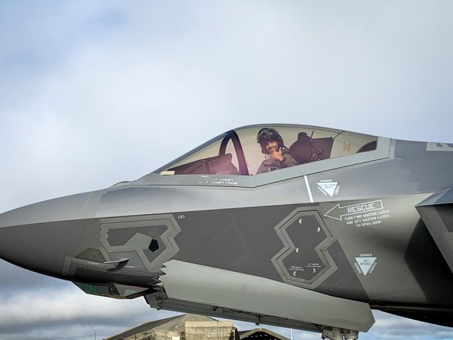 ·Uno de los pilotos del AMI saluda a la cámara desde el cockpit de su F-35A. (foto: AMI).