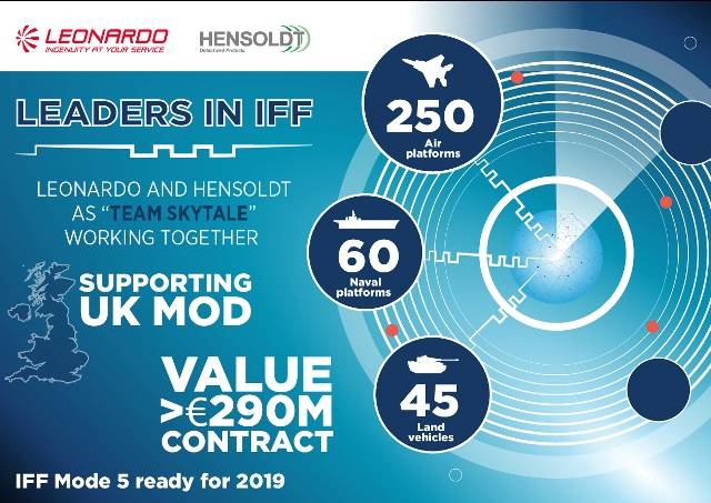 Leonardo ha firmado un contrato con el Ministerio de Defensa del Reino Unido de más de 290 millones de euros conjuntamente con Hensoldt, asociadas en el Team Skytale, para modernizar la tecnología de identificación de amigo-enemigo IFF (Identification Friend or Foe) en más de 350 aeronaves de 11 tipos diferentes (manejados por Leonardo), navíos de 18 clases diversas y sistemas de defensa aérea en dos plataformas distintas (en ambos casos acometidos por Hensoldt) basados en tierra al estándar Modo 5, mediante señales electrónicas automáticas.
