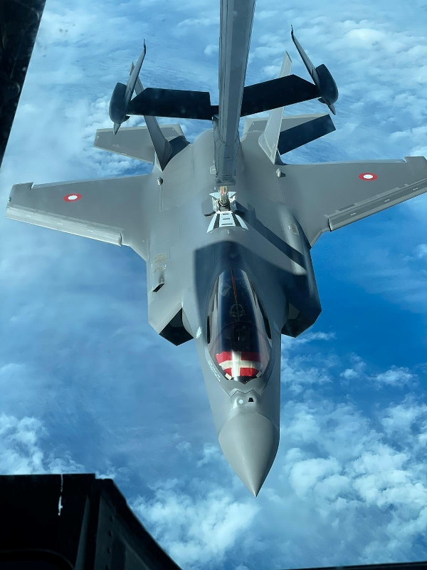 Repostaje en vuelo de uno de los F-35 daneses durante el trayecto. (foto Flyvevåbnet)