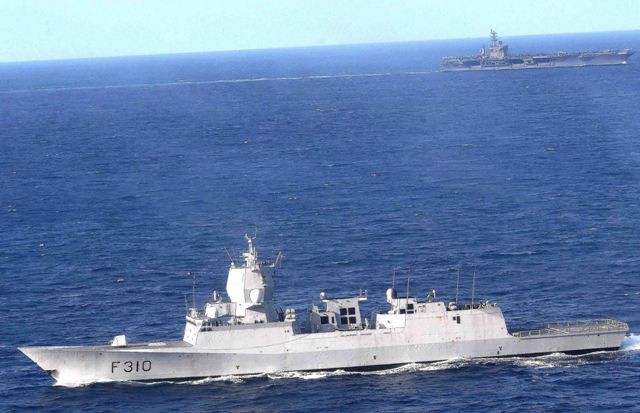 Fotografía: La fragata “Nansen”, al fondo se puede ver al portaaviones USS “Dwight D. Eisenhower”. (foto USA Navy)