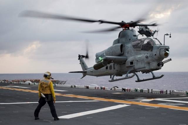 Fotografía: Un AH-1Z Viper del Escuadrón de Ataque Ligero de los Marines (HMLA) 369 aterriza sobre la cubierta del buque de asalto anfibio estadounidense USS Bonhomme Richard (LHD 6) (US Navy)