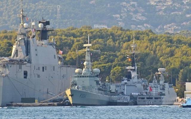 ·El navío de Marruecos, a la derecha con el número 614 pintado en el espejo de popa, comparase con el tamaño del navío anfibio español, “Juan Carlos I”. Foto: Marine Nationale.