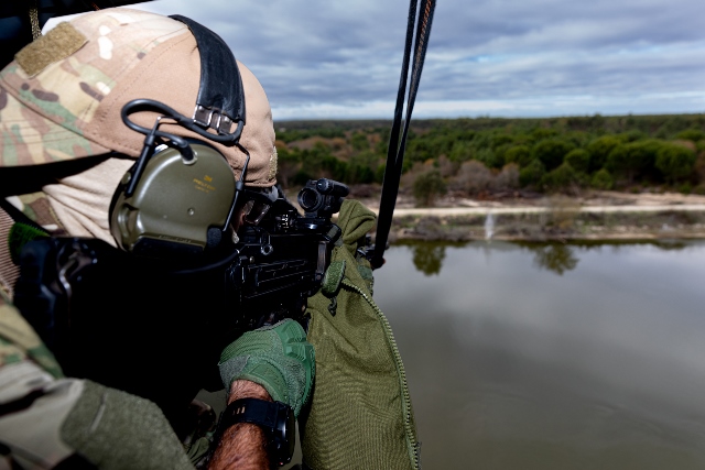 Desde nuestra posición pudimos identificar que batía sin problemas los objetivos. EL AW119 MkII Koala, volado por un piloto que conocía bien como desplazarse a buena velocidad y muy baja cota para hacer que fuese más difícil de batir por un hipotético adversario, iba realizando pasadas en ambos sentidos y desde el mismo se realizaban acciones de fuego. Tras las prácticas de los sniper, que buscaban actuar como DMRs (Designated Markman Rifle) sobre objetivos concretos, llegó el momento de que otro personal practicase acciones de supresión zonal con sus ametralladoras Heckler & Koch MG4 del 5,56x45mm; sus visores de punto rojo facilitaban el encare al objetivo donde proyectaban sus disparos a ráfagas especialmente contundentes.