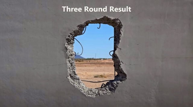 La precisión en las pruebas está clara. Tres impactos juntos en un muro han abierto una brecha en él. (US Army)
