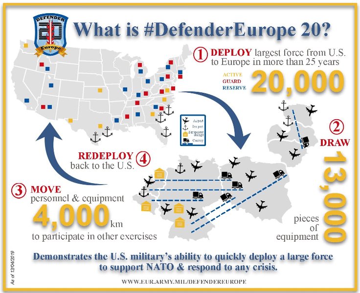 Defender Europe 20 tendrá lugar de abril a julio e implicará en total la participación de aproximadamente 37.000 efectivos de 18 países diferentes, además de los militares que vienen de los Estados Unidos, participarán 9.000 de los que tienen base permanente en los diferentes países europeos, entre ellos España. Al enorme componente humano se suma una ingente cantidad de material militar, trasladado o previamente almacenado en Europa por el US Army (Ejército de los Estados Unidos).