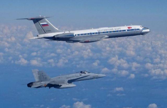Fotografia: Un EF-18 del Ala 15 del Ejército del Aire español escolta un Tu-134 ruso sobre el Báltico (foto Ejército del Aire).