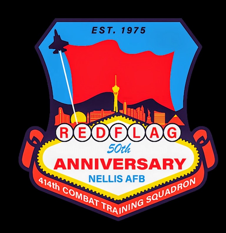 Logo del 50 aniversario del “Red Flag”, debajo lleva el nombre del 414º Escuadrón de Entrenamiento de Combate, la unidad que gestiona la base. (Fuerza Aérea de los Estados Unidos)
