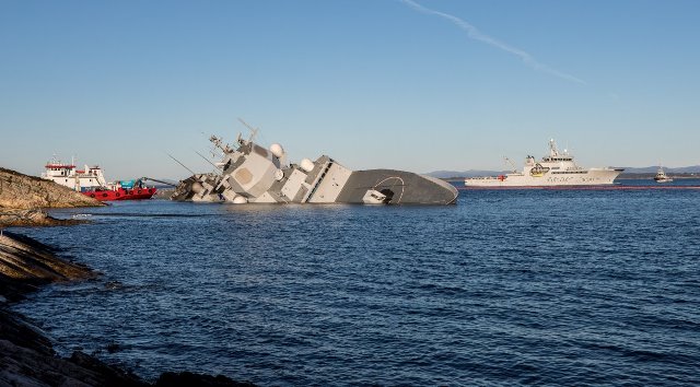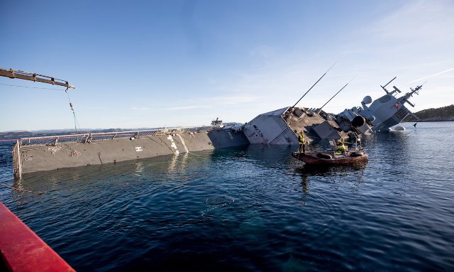 ·Vista de la fragata noruega, y los barcos que están trabajando en intentar recuperarla. (foto: Sjøforsvaret).