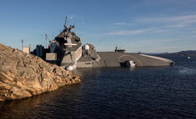 ·La fragata “Helge Instad” está casi hundida, sobresaliendo del agua parte de la Imagen digital del nuevo navío logístico TLET. (foto: Sjøforsvaret).