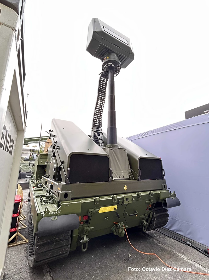 Este encuadre trasero permite observar los dos lanzadores dobles de misiles y, en posición central, el radar tridimensional con pedestal para elevar la antena. Foto: Octavio Díez Cámara