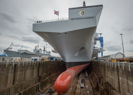 Foto: El portaaviones HMS “Queen Elizabeth II” en el dique nº 1 del astillero de Rosyth, sito en el estuario de Clyde, en Escocia (foto BAE Systems).