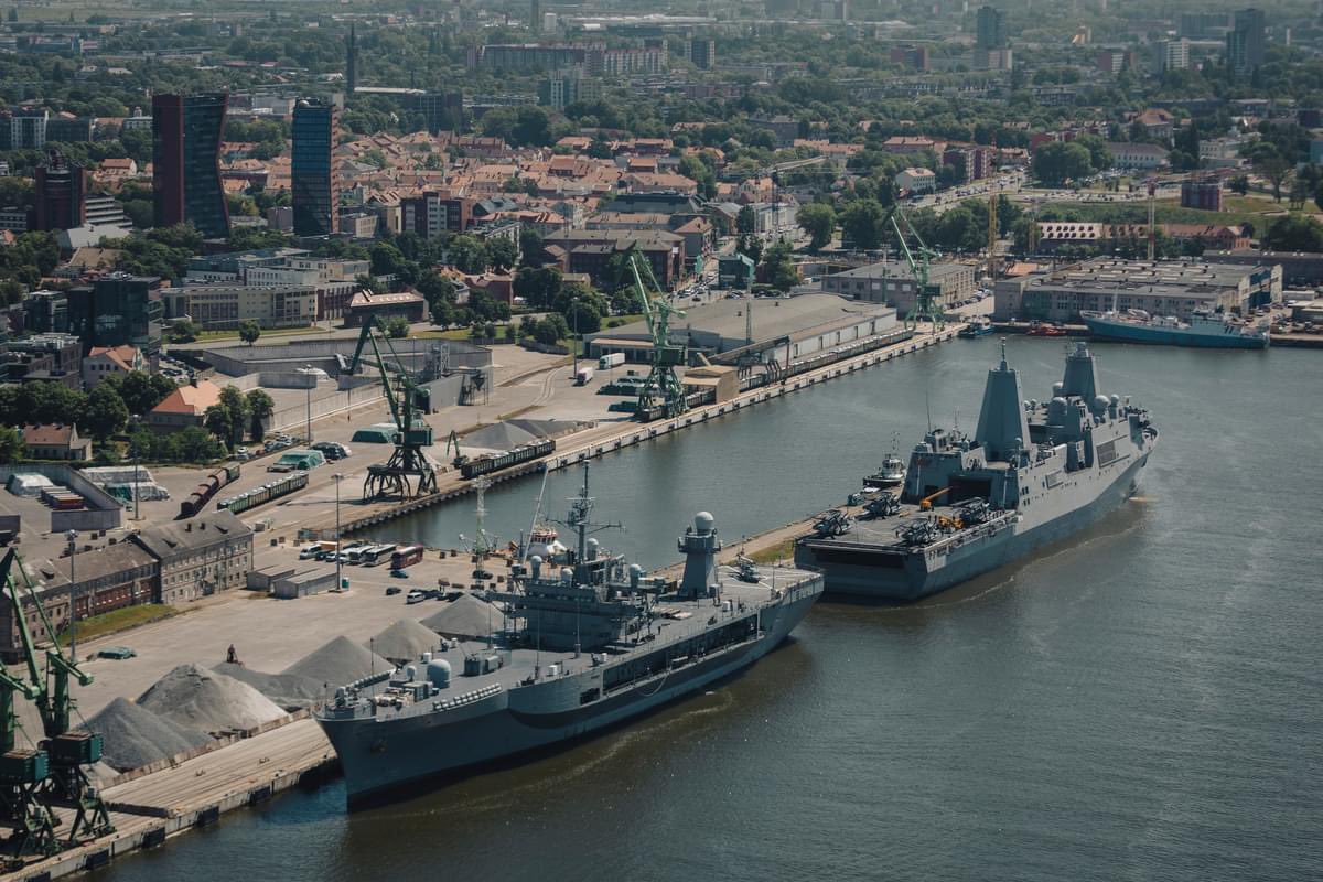 Dos de los navíos de Estados Unidos (un buque de mando y uno de asalto anfibio) participantes en BALTOPS 24, los días previos en el puerto de Klaipéda (Lituania). (foto US Navy Europe).