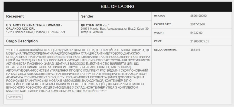 En una nota de dicha empresa del pasado 12 de julio a la que ha tenido acceso defensa.com se publica el Listado de Carga correspondiente a un encargo realizado por el Mando de Contratación del Ejército de Tierra estadounidense de Orlando, Florida (U.S. Army Contracting Command Orlando u ACC-ORL) a la empresa ucraniana SFTC “Progress” consistente en un radar de defensa aérea tridimensional “36D6M1-1”.