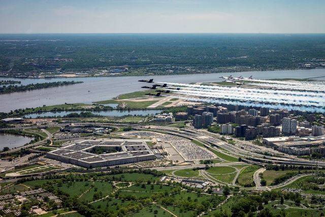Fotografía: Aviones de la Fuerza Aérea y la Marina estadounidense sobrevuelan el Pentágono el 2 de mayo de 2020 (Departamento de Defensa)
