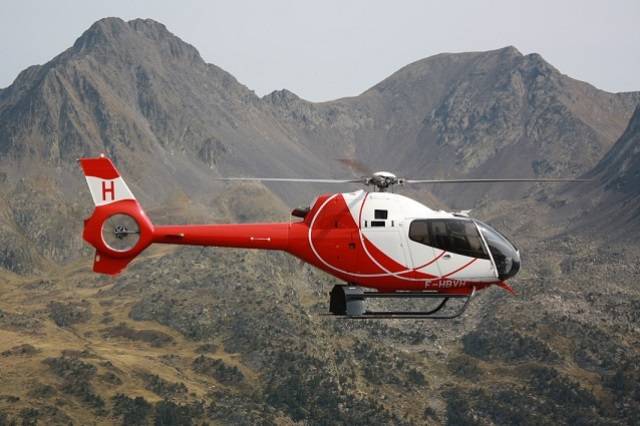 ·Uno de los helicópteros EC120 de Helidax volando sobre los Pirineos. Foto: Stephane Andris.