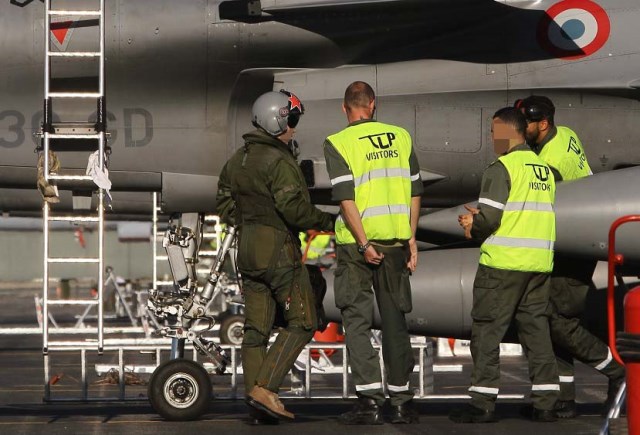 El piloto francés tras completar la misión hablando con los mecánicos de linea. (foto. Julio Maíz/defensa.com)