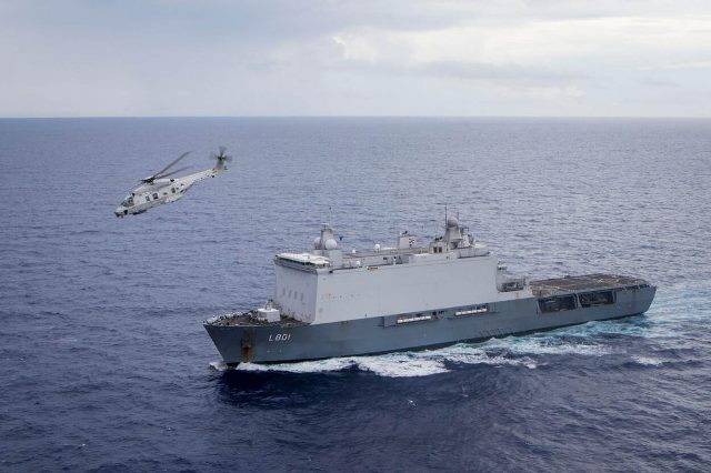Fotografía: El navío “Johan de Witt”, en primer plano se ve un helicóptero NH90 de la Real Marina de los Países Bajos. (foto: Real Armada de los Países Bajos)