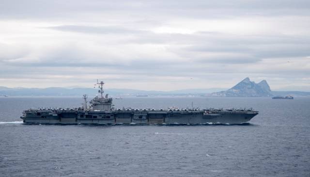 Fotografía: El portaaviones USS “Harry S Truman” cruzando el Estrecho de Gibraltar, al fonde se ve el Peñón. (foto: US Navy).