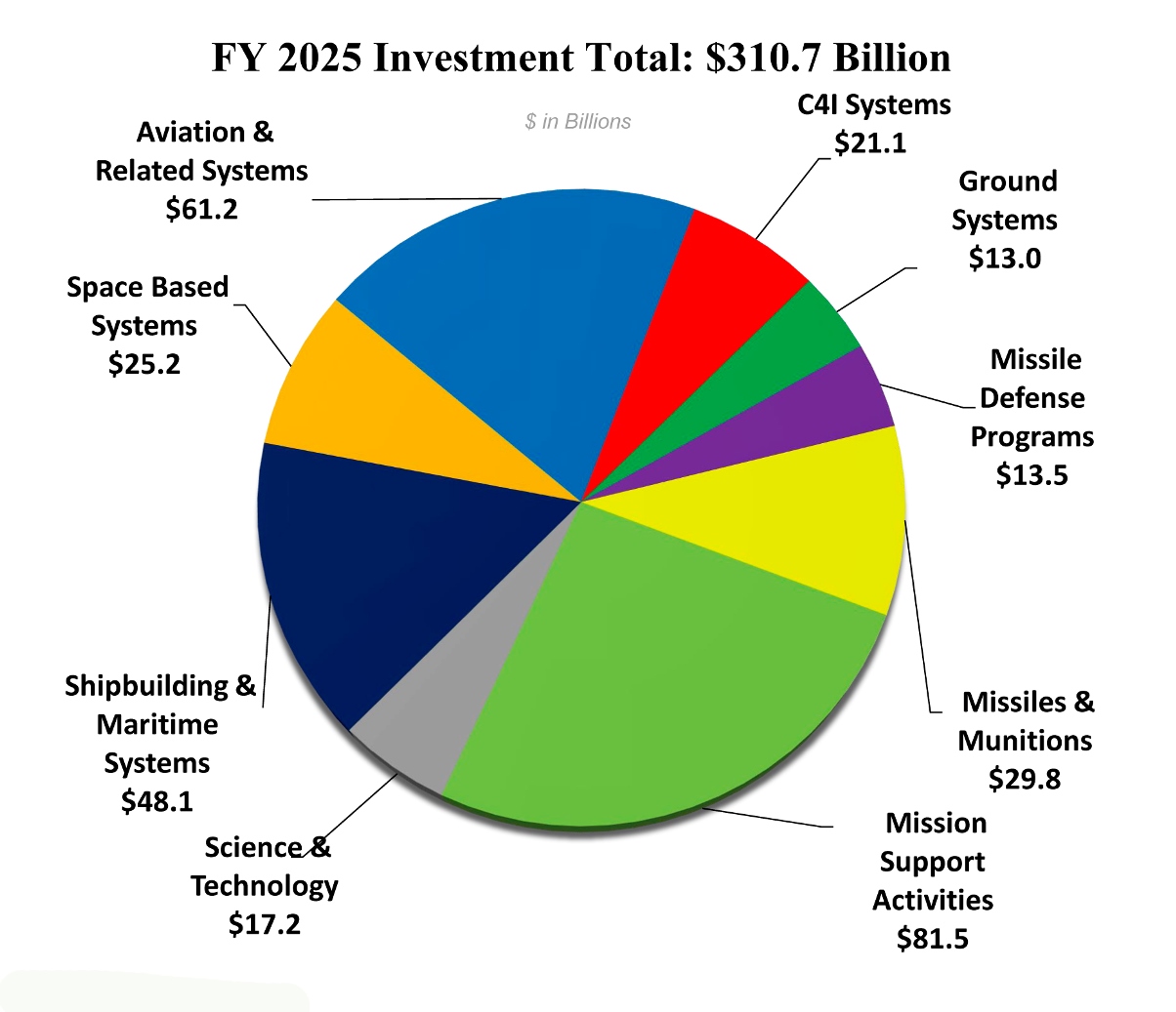 A grandes rasgos, y en función de lo que se expone en varios documentos al respecto, uno genérico y otro referenciado a los programas de adquisición de sistemas de armas y su coste, el Presupuesto de Defensa de 2025 contempla que se gaste un total de 310.700 millones de dólares en armas, en su mantenimiento y en la investigación y desarrollo de nuevas capacidades. Esa cifra se divide en 167.500 millones dedicados directamente a lo que es la obtención de nuevos sistemas y 143.200 millones para investigaciones, adquisiciones, desarrollos o pruebas.