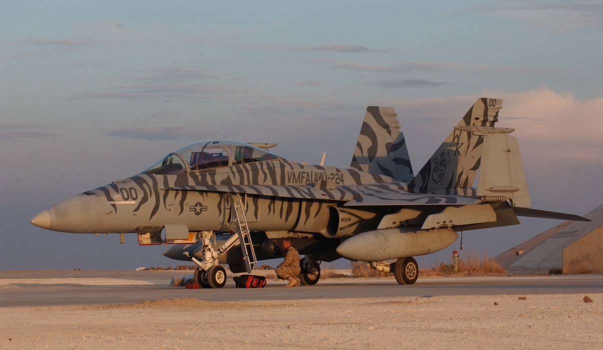El Escuadrón del USMC ya pintó con decoración tigre algunos de sus antiguos F/A-18D “Hornet”. (foto VMFA-224)