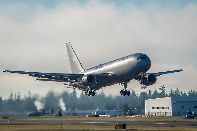 El primer Boeing KC-46A cisterna sera entregado a la USAF el próximo año, tras realizar su primer vuelo despegando de Paine Field el 6 de diciembre. Se trata del séptimo ejemplar de este programa, empleándose los anteriores para ensayos y certificación, totalizando 2.200 horas en el aire y 1.600 contactos de reabastecimiento con F-16, F/A-18, AV-8B, C-17, A-10, KC-10 y el propio KC-46. Se trata de un derivado del birreactor comercial 767 y se ensambla en las instalaciones de Everett del fabricante. Actualmente la Fuerza Aérea estadounidense ha pedido en firme 34 ejemplares y se espera que progresivamente pida hasta 179 de estos birreactores multirrol, que, además de reabastecer de combustible a otras aeronaves en vuelo, también puede transportar pasajeros, carga y pacientes médicos.