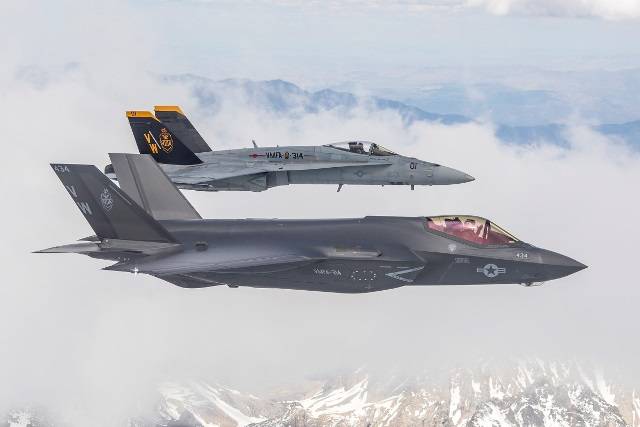 Fotografía: Un F-35C del VMFA-314 (primer plano) volando en formación con uno de los F/A-18A++ a los que sustituirá. (foto: US Navy).