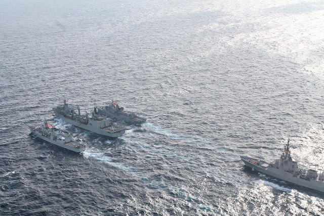 Los navíos beneficiarios del repostaje en la mar, que se llevó a cabo frente a las costas de Argelia, han sido la fragata española “Cristóbal Colón” (F-105), que está a popa del BAC, la turca “Oruçreis” (F-245), que reposta a estribor, y la canadiense “Ville de Quebec” (FHH 332), posicionada a babor.