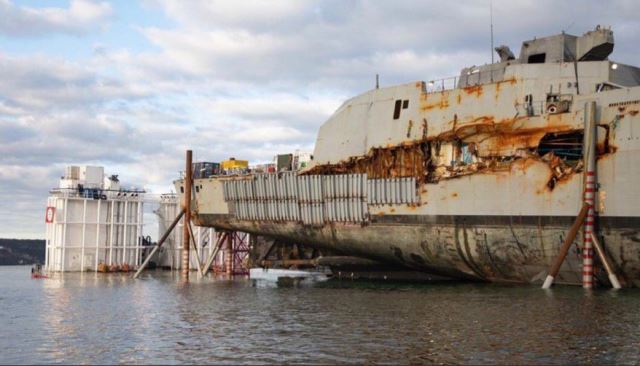 ·Detalle del parcheado con la fragata aún sobre la barcaza (NavyLookout)