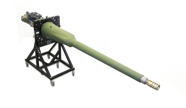El cañón XM913 en su configuración inicial listo para integrarse en la torre ALAS-MC. En la configuración vista recientemente el freno de boca presenta un diseño nuevo y la longitud total del cañón parece ser menor. (U.S. Army)