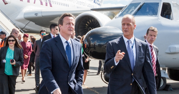 ·David Cameron junto a Tom Enders durante su visita al stand de Airbus DS en Farnborugh el año pasado.