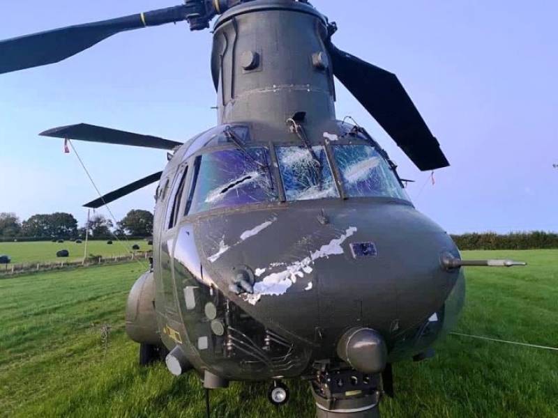 Un helicóptero de carga pesada Boeing CH-47 o Chinook HC.6A de la RAF (Royal Air Force) realizó un aterrizaje de emergencia en unos terrenos de cultivo de Carmarthenshire (Gales). La aeronave, con matrícula ZA683, había chocado antes con unos cables de alta tensión, uno de los grandes peligros de los helicópteros cuando realizan vuelos tácticos pegados al terreno.