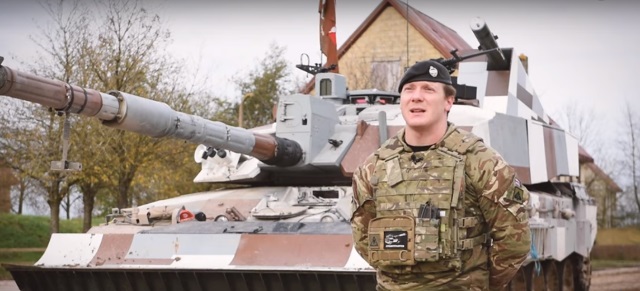 Visibles en esta captura, la pala empujadora, el lanzador de Javelin con un misil visible y la ametralladora adicional (captura vídeo British Army)