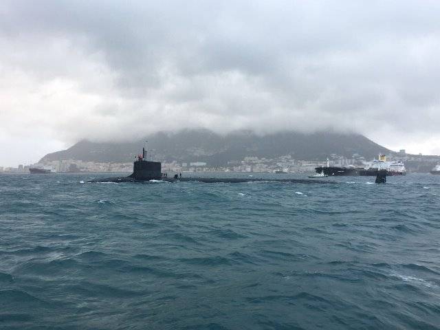 Fotografía: El submarino estadounidense nuclear USS John Warner frente al Peñón de Gibraltar. Foto MOD Gibraltar.