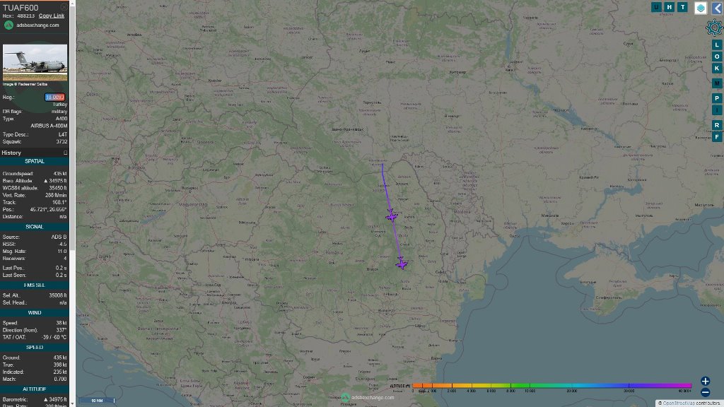 Captación de la imagen de la vuelta de los A400M turcos desde Kiev a través de la web ads-b exchange. (foto ads-b exchange)