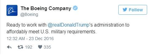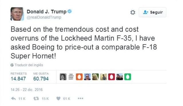 El presidente electo estadounidense, el magnate Donald Trump, volvió a recurrir a las redes sociales para mandar otro “recado” al F-35 y a su fabricante, Lockheed Martin. Con uno de sus ya habituales mensajes en twitter, el pasado 22 de diciembre Trump afirmaba haberse puesto en contacto con Boeing para interesarse por la posibilidad de un F-18 Super Hornet “comparable al F-35”. Al día siguiente Boeing utilizaba el mismo canal para anunciar su predisposición a colaborar con la administración Trump para cumplir los requerimientos militares estadounidenses.