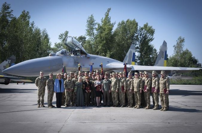 El presidente ucraniano Zelenski y el resto asistentes a la presentación, ante unos de los Sukhoi Su-27. (foto Ministerio de Defensa de Ucrania)