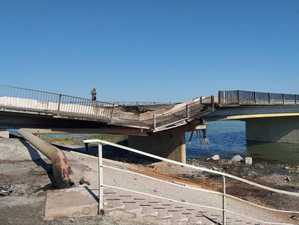 El puente de Henichesk, que habría sido destruido por un misil crucero SCALP-EG lanzado por un Sukhoi Su-24M ucraniano.